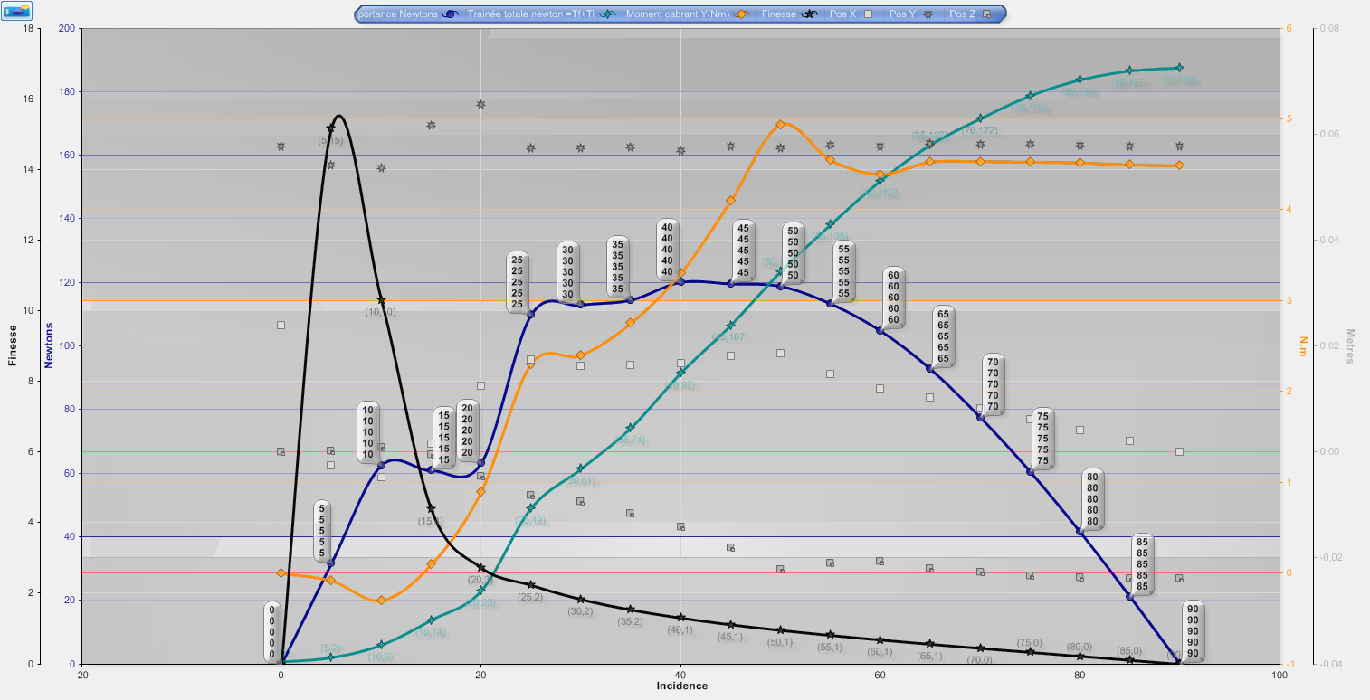 • -Montée en portance ultra rapide dés les faibles angles d'attaque (120 newtons dés 10 degrés pour une vitesse 14m/s).