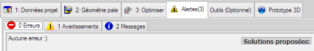 L'onglet suivant indique les erreurs éventuelles de conception et les messages d'avertissements (protection contre les accidents et limites des calculs théoriques) :