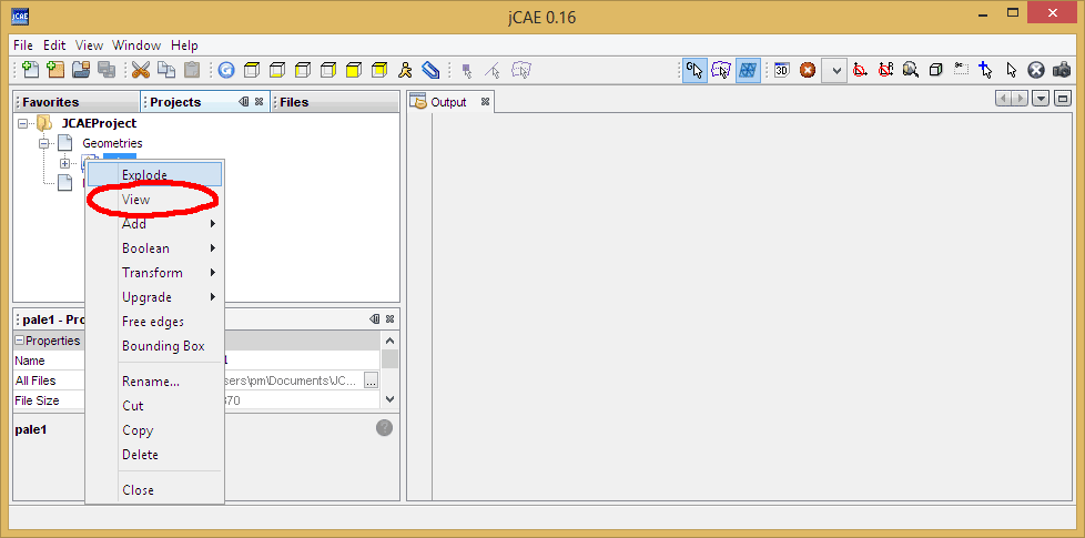 jCAE s'active et vous voyez une barre verte style K2000 en bas à droite, et la la fenêtre output se remplit.