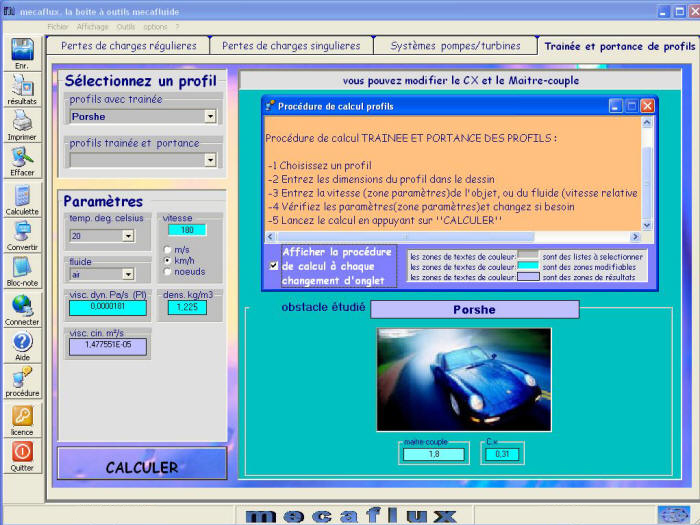 Vous choisissez un véhicule et vous modifiez les paramètres de vitesse ou du fluide et la force de résistance et la puissance consommée vous sont données...